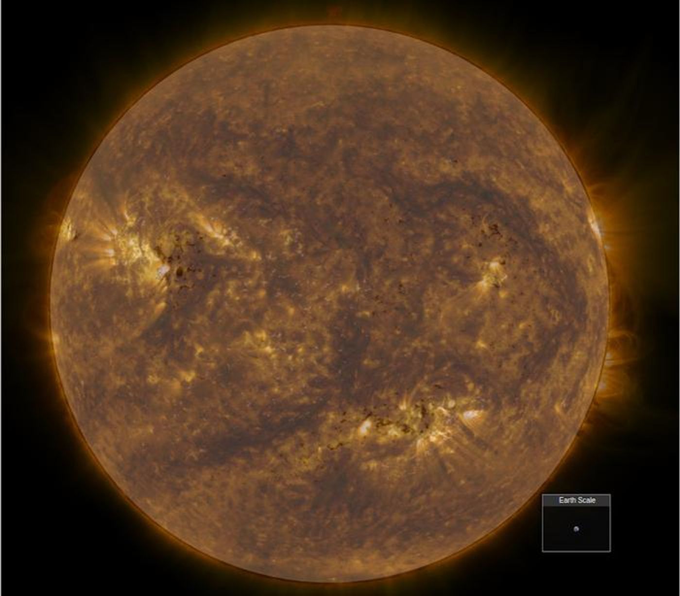 Immagine ultravioletta che mostra una scarica di plasma coronale solare misurata a milioni di gradi con la Terra per scala.